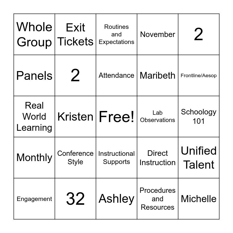 This bingo card has a free space and 29 words: Engagement, January, Kristen, Clinics, Whole Group, Routines and Expectations, 2, Conference Style, Lab Observations, 32, Schoology 101, Michelle, Ashley, Procedures and Resources, Frontline/Aesop, Well-being, Instructional Supports, Monthly, 2, Real World Learning, Direct Instruction, Mentoring, Maribeth, Panels, November, Exit Tickets, Unified Talent, Attendance and Stipend.