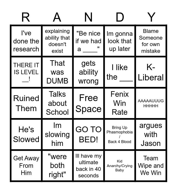 This bingo card has a free space and 29 words: Get Away From Him, *Gets Drunk*, Talks about School, My Death doesn't count, I've done the research, "Be nice if we had a ____", That was DUMB, Im slowing him, Fenix Win Rate, "were both right", AAAAAUUUG HHHHH, Team Wipe and We Win, Ill have my ultimate back in 40 seconds, Kid Anarchy/Crying Baby, K-Liberal, Look what I did, GO TO BED!, He's Slowed, Blame Someone for own mistake, Ruined Them, Bring Up Phasmophobia / Back 4 Blood, Remember that one Illidan game, I like the ___, THERE IT IS LEVEL __!, Im gonna look that up later, explaining ability that doesn't exist, argues with Jason, gets ability wrong and Baby in a washing machine.