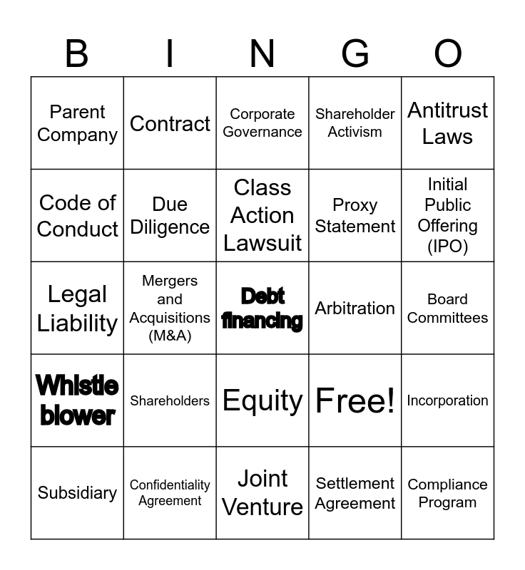This bingo card has 25 words: Shareholders, Joint Venture, Class Action Lawsuit, Subsidiary, Antitrust Laws, Parent Company, Code of Conduct, Contract, Arbitration, Equity, Proxy Statement, Legal Liability, Free!, Incorporation, Due Diligence, Compliance Program, Board Committees, Corporate Governance, Initial Public Offering (IPO), Mergers and Acquisitions (M&A), Debt financing, Confidentiality Agreement, Whistle blower, Shareholder Activism and Settlement Agreement.