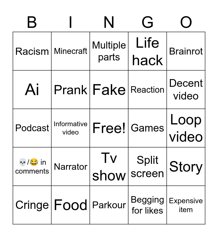 This bingo card has a free space and 24 words: Narrator, Food, Fake, Cringe, Brainrot, Racism, Ai, Minecraft, Games, Tv show, Reaction, Podcast, Split screen, Story, Prank, Begging for likes, Loop video, Multiple parts, Decent video, Informative video, Expensive item, 💀/😂 in comments, Life hack and Parkour.