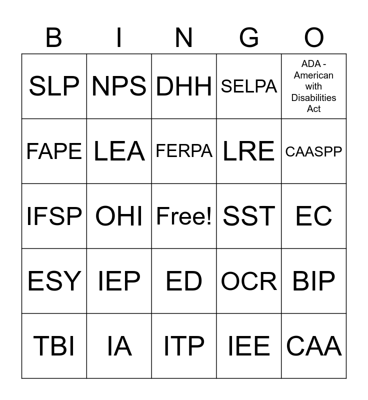 This bingo card has a free space and 24 words: TBI, IEP, FERPA, IEE, ADA - American with Disabilities Act, SLP, NPS, DHH, SST, EC, IFSP, LEA, OCR, BIP, FAPE, IA, ITP, SELPA, CAASPP, ESY, OHI, ED, LRE and CAA.