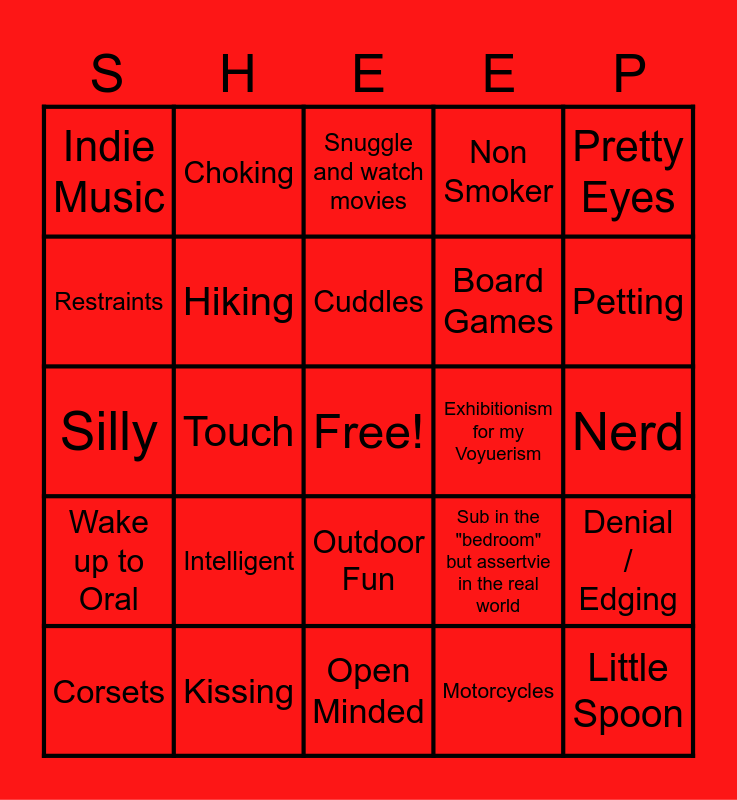 This bingo card has a free space and 24 words: Intelligent, Kissing, Cuddles, Corsets, Pretty Eyes, Indie Music, Restraints, Choking, Exhibitionism for my Voyuerism, Outdoor Fun, Board Games, Silly, Sub in the "bedroom" but assertvie in the real world, Denial / Edging, Hiking, Motorcycles, Nerd, Snuggle and watch movies, Petting, Touch, Little Spoon, Wake up to Oral, Non Smoker and Open Minded.