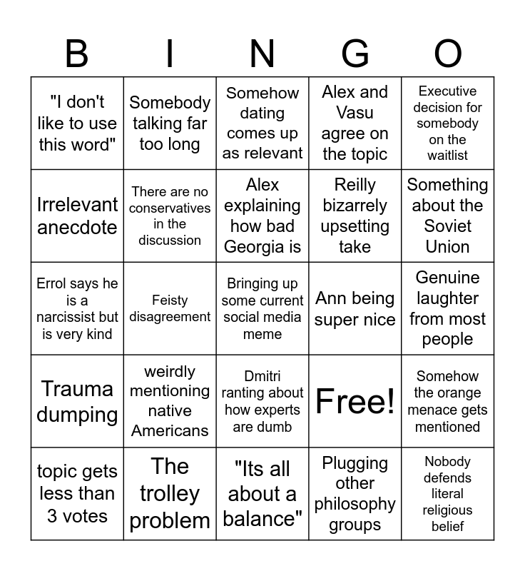 This bingo card has 25 words: weirdly mentioning native Americans, "Its all about a balance", Alex explaining how bad Georgia is, topic gets less than 3 votes, Executive decision for somebody on the waitlist, "I don't like to use this word", Irrelevant anecdote, Somebody talking far too long, Ann being super nice, Dmitri ranting about how experts are dumb, Reilly bizarrely upsetting take, Errol says he is a narcissist but is very kind, Free!, Somehow the orange menace gets mentioned, There are no conservatives in the discussion, Nobody defends literal religious belief, Genuine laughter from most people, Somehow dating comes up as relevant, Something about the Soviet Union, Feisty disagreement, Bringing up some current social media meme, The trolley problem, Trauma dumping, Alex and Vasu agree on the topic and Plugging other philosophy groups.