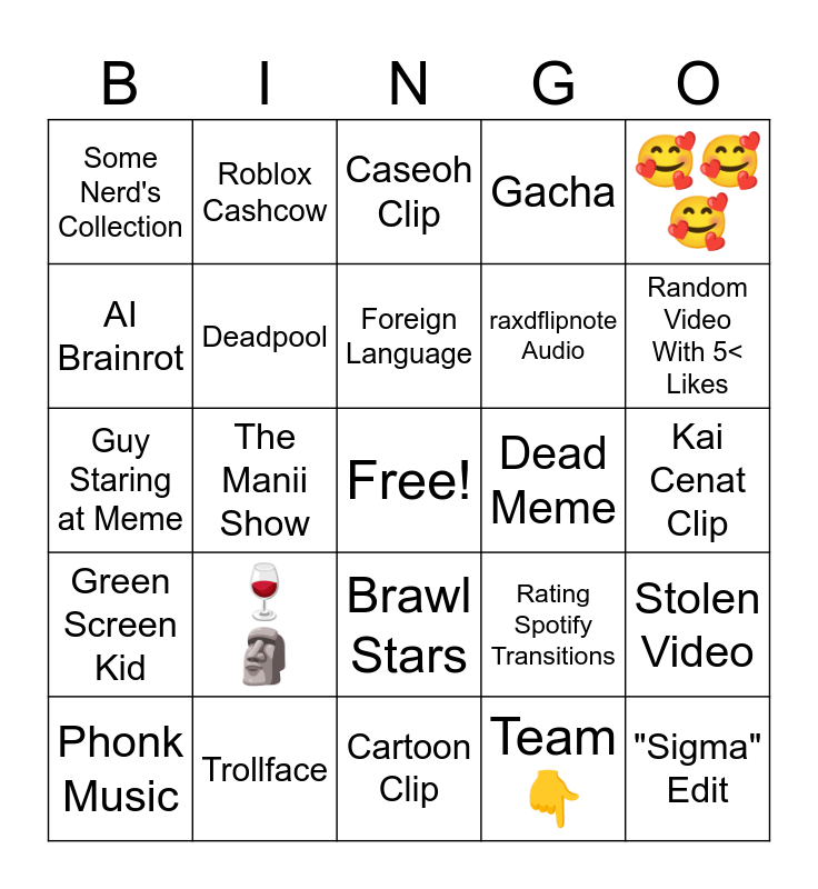 This bingo card has a free space and 24 words: 🍷🗿, Trollface, Foreign Language, Phonk Music, 🥰🥰🥰, Some Nerd's Collection, AI Brainrot, Roblox Cashcow, Dead Meme, Brawl Stars, raxdflipnote Audio, Guy Staring at Meme, Rating Spotify Transitions, Stolen Video, Deadpool, Team 👇, Kai Cenat Clip, Caseoh Clip, Random Video With 5< Likes, The Manii Show, "Sigma" Edit, Green Screen Kid, Gacha and Cartoon Clip.