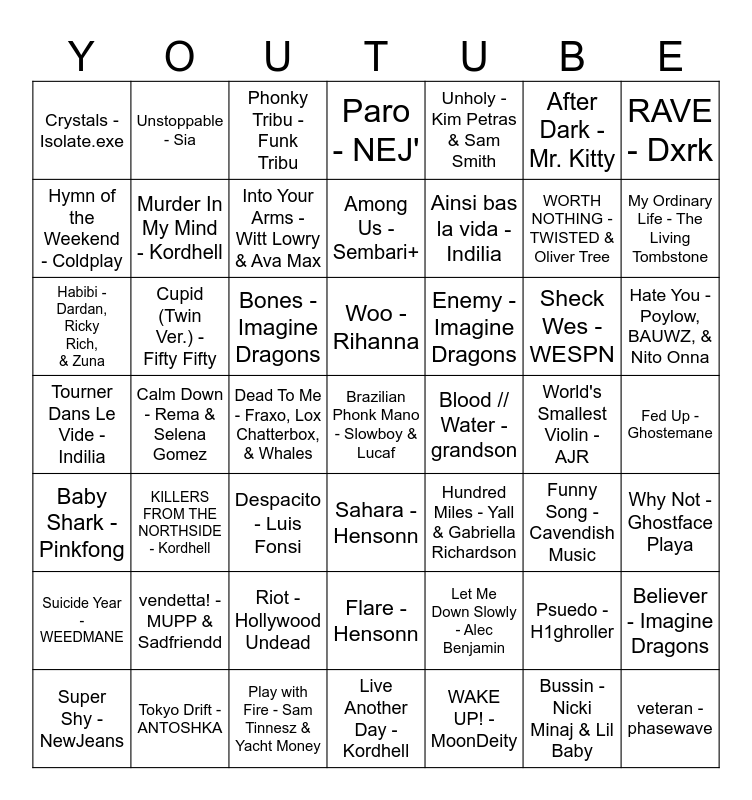 This bingo card has 84 words: GHOST! - KIIXSHI & phonk.me, Flare - Hensonn, Phonky Tribu - Funk Tribu, Tokyo Drift - ANTOSHKA, PSYCHO CRUISE - ONIMXRU & STRAWANGLE, Land Of Fire - Kordhell, vendetta! - MUPP & Sadfriendd, Disaster - KSLV Noh, Suicide Year - WEEDMANE, Live Another Day - Kordhell, Phonky Town - PlayaPhonk, Close Eyes - DVRST, RAVE - Dxrk, My Ordinary Life - The Living Tombstone, METAMORPHOSIS - INTERWORLD, Crystals - Isolate.exe, Hate You - Poylow, BAUWZ, & Nito Onna, After Dark - Mr. Kitty, Enemy - Tommee Profitt, Sam Tinnesz, & Beacon Light, Sahara - Hensonn, Why Not - Ghostface Playa, Murder In My Mind - Kordhell, WORTH NOTHING - TWISTED & Oliver Tree, GigaChad Theme - g3ox_em, Ainsi bas la vida - Indilia, NEED 4 SPEED - nightcity., WAKE UP! - MoonDeity, Scopin - Kordhell, NEON BLADE - MoonDeity, Go Down Deh - Spice, Sean Paul, & Shaggy, Bones - Imagine Dragons, STAY - The Kid LAROI & Justin Bieber, Hundred Miles - Yall & Gabriella Richardson, Among Us - Sembari+, Brazilian Phonk Mano - Slowboy & Lucaf, World's Smallest Violin - AJR, Calm Down - Rema & Selena Gomez, Flower - JISOO, Into Your Arms - Witt Lowry & Ava Max, Cupid (Twin Ver.) - Fifty Fifty, KILLERS FROM THE NORTHSIDE - Kordhell, Funny Song - Cavendish Music, Queencard - (G)-IDLE, Makeba - Jain, Super Shy - NewJeans, Believer - Imagine Dragons, Unstoppable - Sia, Let Me Down Slowly - Alec Benjamin, Rockstar - Ilkay Sencan & Dynoro, Sunflower (Remix) - Post Malone & Swae Lee, Despacito - Luis Fonsi, Enemy - Imagine Dragons, Paro - NEJ', Kings & Queens - Ava Max, Derniere Danse - Indilia, INDUSTRY BABY - Lil Nas X, Tourner Dans Le Vide - Indilia, Hymn of the Weekend - Coldplay, Polozhenie (Remix) - Night Lovell, Habibi - Dardan, Ricky Rich, & Zuna, Hey Mama - David Guetta, Nicki Minaj, BebeRexha, & Afrojack, Wahran - RANDALL, Dark Light - BeatsHoundz & VOLB3X, Bez tabja ja ne ja - HammAli, Navai, & JONY, Moye Moye - Daler Mehndi, Baby Shark - Pinkfong, Dame Tu Cosita - El Chombo, Jalebi Baby - Jason Derulo & Tesher, Unholy - Kim Petras & Sam Smith, On My Own - Darci, Sheck Wes - WESPN, masquerade - slaysiouxxie, Psuedo - H1ghroller, Sleepwalker - akiaura, LONOWN, & STM, Woo - Rihanna, Dead To Me - Fraxo, Lox Chatterbox, & Whales, Heartbeat - Childish Gambino, Bussin - Nicki Minaj & Lil Baby, veteran - phasewave, Fed Up - Ghostemane, Blood // Water - grandson, Play with Fire - Sam Tinnesz & Yacht Money, Riot - Hollywood Undead and Space Cadet - Metro Boomin & Gunna.