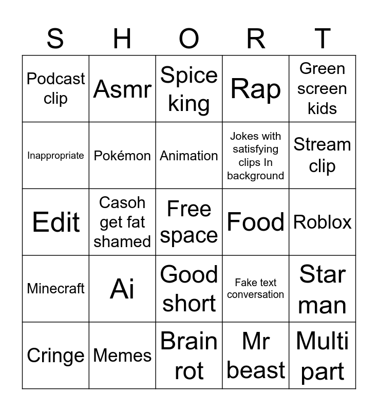 This bingo card has a free space and 24 words: Cringe, Ai, Animation, Mr beast, Green screen kids, Podcast clip, Asmr, Spice king, Food, Roblox, Edit, Pokémon, Fake text conversation, Star man, Inappropriate, Memes, Brain rot, Rap, Stream clip, Minecraft, Casoh get fat shamed, Good short, Jokes with satisfying clips In background and Multi part.