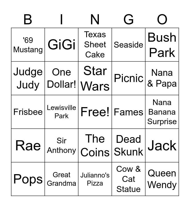 This bingo card has a free space and 29 words: Pops, (Awesome) Kness!, Lewisville Park, Rai, '69 Mustang, Texas Sheet Cake, One Dollar!, Sir Anthony, Fames, Great Grandma, Nana Banana Surprise, Queen Wendy, Julianno's Pizza, Cow & Cat Statue, Nana & Papa, Accordion, The Coins, Rae, Bush Park, Frisbee, Dead Skunk, Monster Tree, Picnic, Judge Judy, Seaside, GiGi, Jack, Star Wars and Birthday Box.