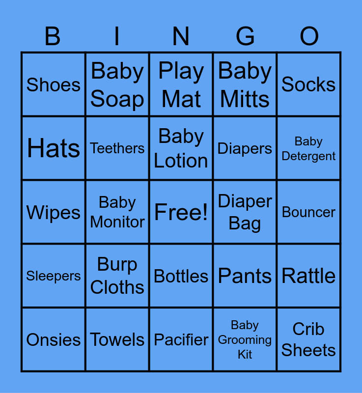 This bingo card has a free space and 24 words: Burp Cloths, Towels, Baby Lotion, Onsies, Socks, Shoes, Hats, Baby Soap, Diaper Bag, Bottles, Diapers, Wipes, Pants, Rattle, Teethers, Baby Grooming Kit, Bouncer, Play Mat, Baby Detergent, Baby Monitor, Crib Sheets, Sleepers, Baby Mitts and Pacifier.