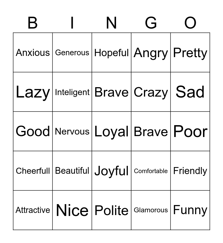 This bingo card has a free space and 24 words: Beautiful, Nice, Brave, Attractive, Pretty, Anxious, Lazy, Generous, Brave, Joyful, Crazy, Good, Comfortable, Friendly, Inteligent, Glamorous, Poor, Hopeful, Sad, Nervous, Funny, Cheerfull, Angry and Polite.