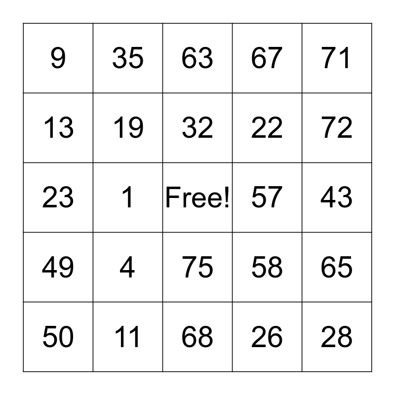 This bingo card has a free space and 24 words: 4, 11, 32, 50, 71, 9, 13, 35, 57, 75, 22, 23, 58, 65, 19, 26, 43, 63, 72, 1, 28, 49, 67 and 68.