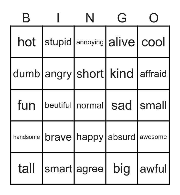This bingo card has a free space and 24 words: brave, smart, short, tall, cool, hot, dumb, stupid, sad, happy, kind, fun, absurd, awesome, angry, big, small, annoying, affraid, beutiful, awful, handsome, alive and agree.