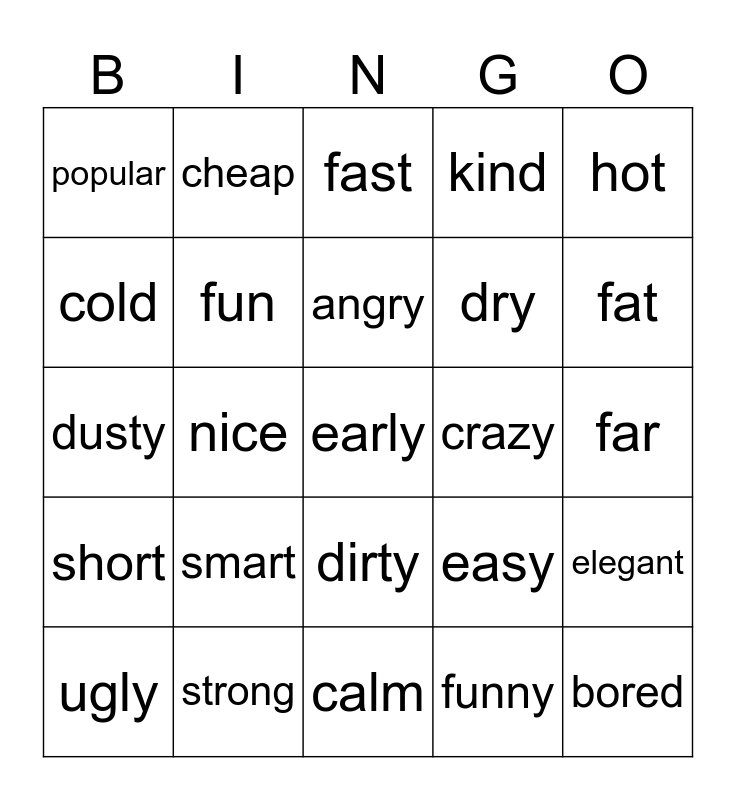 This bingo card has a free space and 24 words: smart, strong, angry, ugly, hot, popular, cold, cheap, crazy, dirty, dry, dusty, easy, elegant, fun, funny, far, fast, fat, nice, bored, short, kind and calm.