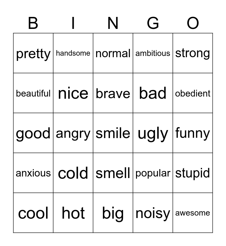 This bingo card has a free space and 24 words: cold, hot, brave, cool, strong, pretty, beautiful, handsome, ugly, smell, bad, good, popular, stupid, nice, noisy, funny, normal, obedient, angry, awesome, anxious, ambitious and big.