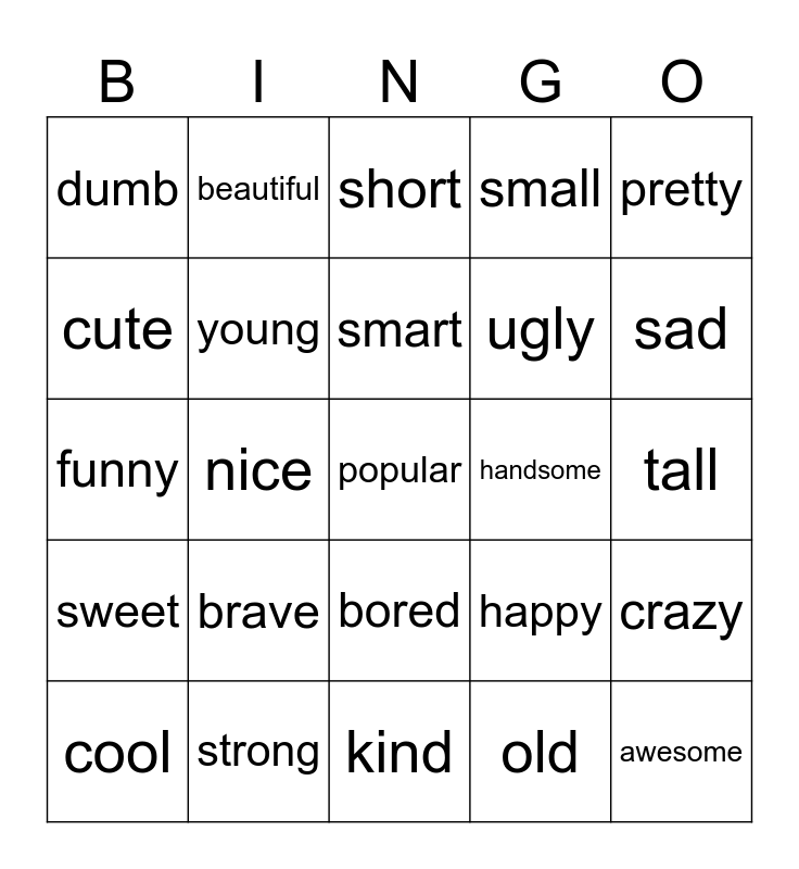 This bingo card has a free space and 24 words: brave, strong, smart, cool, pretty, dumb, cute, beautiful, handsome, bored, ugly, funny, happy, crazy, young, old, tall, short, sad, nice, awesome, sweet, small and kind.