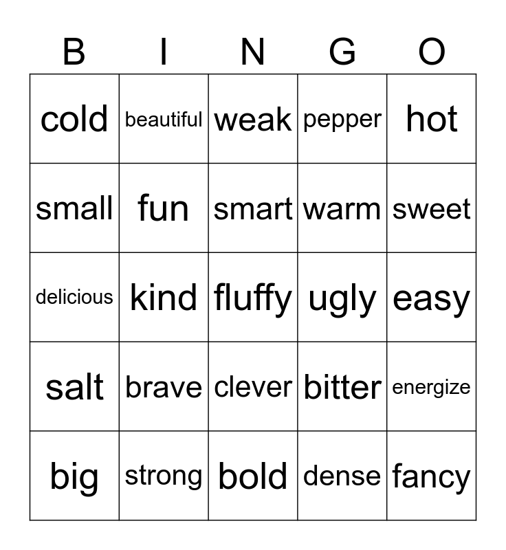 This bingo card has a free space and 24 words: brave, strong, smart, big, hot, cold, small, beautiful, ugly, clever, warm, delicious, bitter, energize, fun, dense, easy, weak, sweet, kind, fancy, salt, pepper and bold.