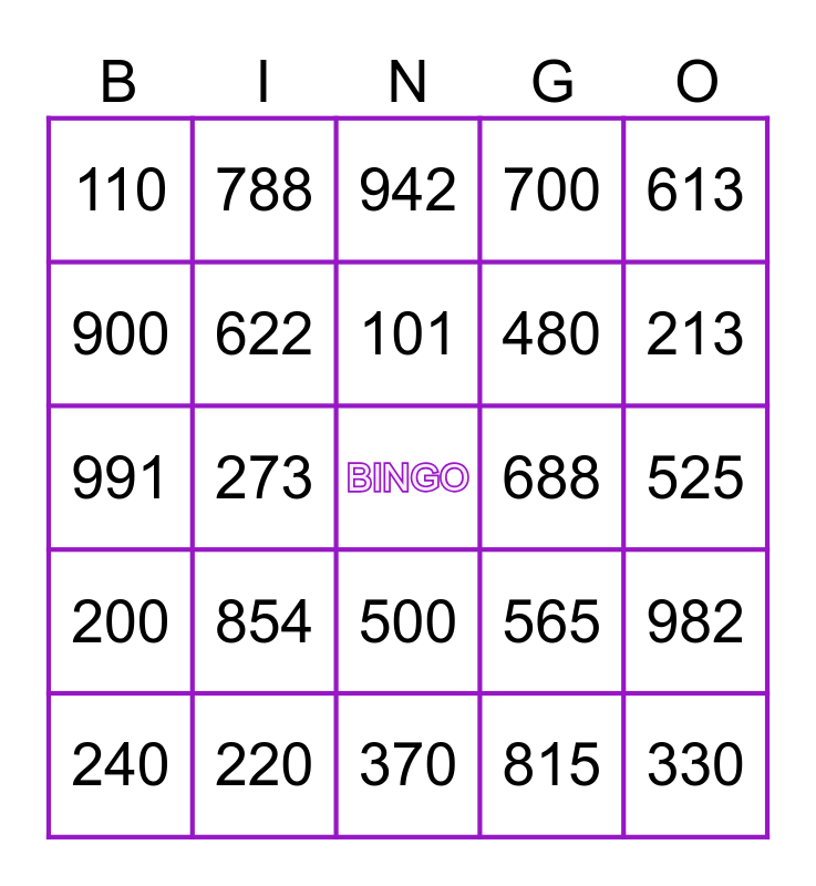 This bingo card has a free space and 54 words: 100, 200, 300, 400, 500, 600, 700, 800, 900, 840, 110, 150, 220, 240, 260, 370, 330, 480, 490, 525, 565, 533, 688, 613, 633, 788, 703, 799, 805, 815, 829, 865, 875, 901, 942, 943, 991, 982, 503, 622, 642, 747, 758, 777, 854, 884, 975, 965, 101, 273, 213, 398, 313 and 444.