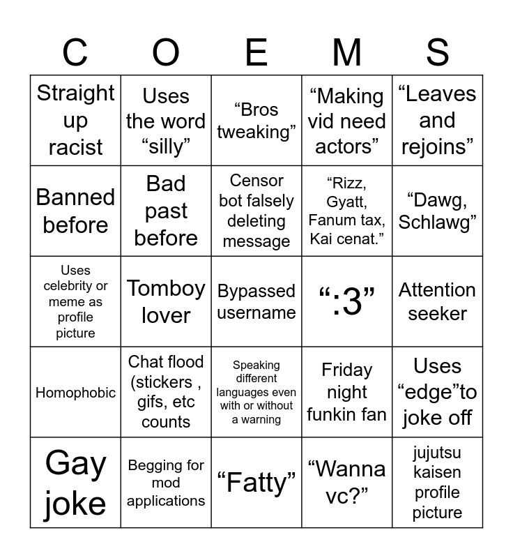 This bingo card has a free space and 24 words: Chat flood (stickers , gifs, etc counts, Begging for mod applications, Censor bot falsely deleting message, Gay joke, “Leaves and rejoins”, Straight up racist, Banned before, Uses the word “silly”, “:3”, Speaking different languages even with or without a warning, “Rizz, Gyatt, Fanum tax, Kai cenat.”, Uses celebrity or meme as profile picture, Friday night funkin fan, Uses “edge”to joke off, Bad past before, “Wanna vc?”, Attention seeker, “Bros tweaking”, “Dawg, Schlawg”, Tomboy lover, jujutsu kaisen profile picture, Homophobic, “Making vid need actors” and “Fatty”.