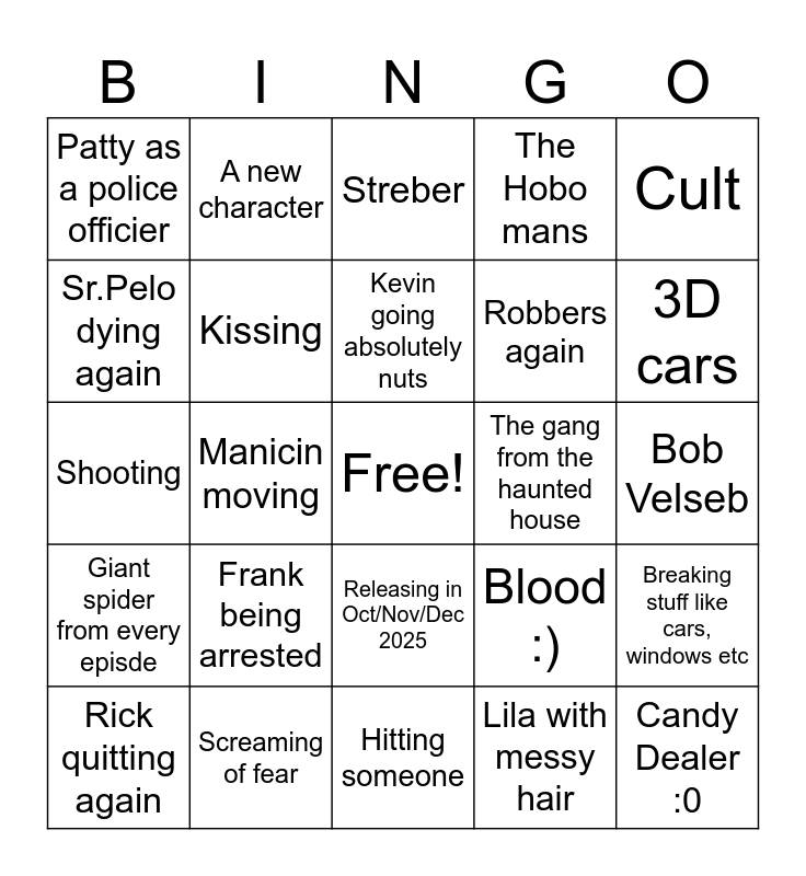 This bingo card has a free space and 24 words: Rick quitting again, Frank being arrested, Kevin going absolutely nuts, Lila with messy hair, Cult, Patty as a police officier, A new character, Streber, The gang from the haunted house, Bob Velseb, Shooting, Kissing, Blood :), Breaking stuff like cars, windows etc, Sr.Pelo dying again, Screaming of fear, Hitting someone, The Hobo mans, 3D cars, Giant spider from every episde, Manicin moving, Releasing in Oct/Nov/Dec 2025, Robbers again and Candy Dealer :0.