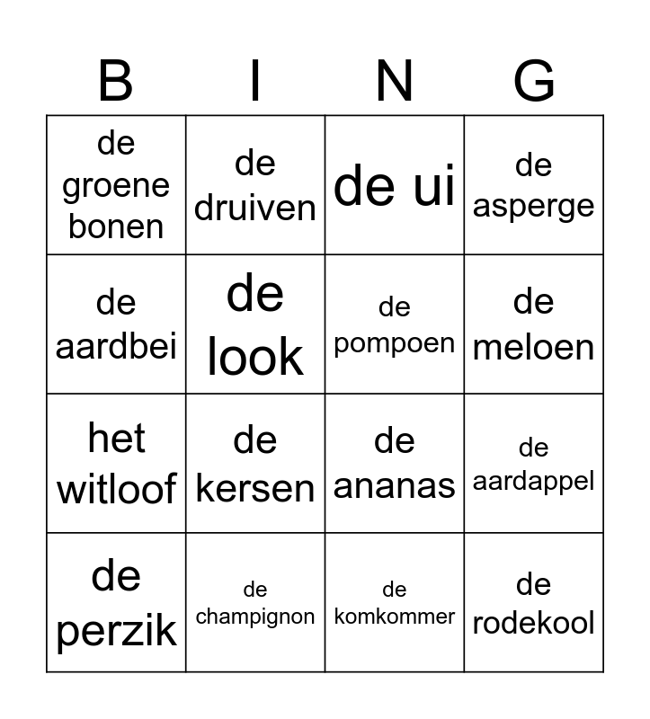 This bingo card has 20 words: de aardappel, de spinazie, de ui, de prei, de perzik, de aardbei, de champignon, de groene bonen, het witloof, de druiven, de kersen, de ananas, de look, de rodekool, de pompoen, de abrikoos, de meloen, de asperge, de komkommer and de spruitjes.