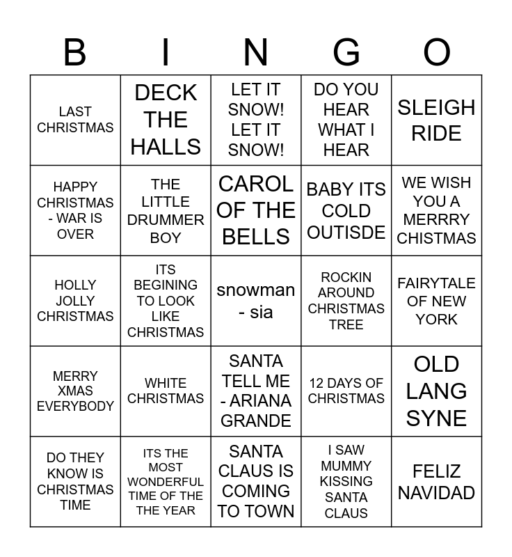 This bingo card has a free space and 29 words: DO THEY KNOW IS CHRISTMAS TIME, JINGLE BELL ROCK, ITS BEGINING TO LOOK LIKE CHRISTMAS, ALL I WANT FOR CHRISTMAS IS YOU, LAST CHRISTMAS, LET IT SNOW! LET IT SNOW!, THE LITTLE DRUMMER BOY, WHITE CHRISTMAS, ROCKIN AROUND CHRISTMAS TREE, ITS THE MOST WONDERFUL TIME OF THE THE YEAR, FAIRYTALE OF NEW YORK, FELIZ NAVIDAD, SANTA CLAUS IS COMING TO TOWN, I SAW MUMMY KISSING SANTA CLAUS, WE WISH YOU A MERRRY CHISTMAS, I WISH IT COULD BE CHRISTMAS EVERY DAY, SANTA TELL ME - ARIANA GRANDE, MERRY XMAS EVERYBODY, SLEIGH RIDE, HOLLY JOLLY CHRISTMAS, 12 DAYS OF CHRISTMAS, SILENT NIGHT, BABY ITS COLD OUTISDE, HAPPY CHRISTMAS - WAR IS OVER, DO YOU HEAR WHAT I HEAR, DECK THE HALLS, OLD LANG SYNE, CAROL OF THE BELLS and STAY ANOTHER DAY - E17.
