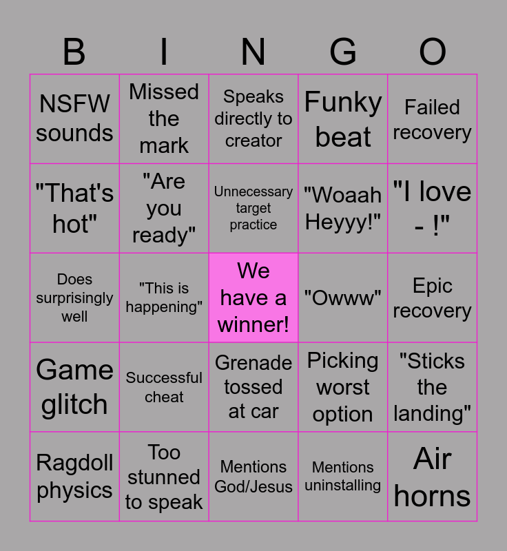 This bingo card has a free space and 66 words: "SCREW YOU ALEX!", "Tetanus!", "A one tiiime", "Sticks the landing", "No big deal", 69, Missed the mark, Pink vehicle, Unnecessary target practice, Failed cheat, Grenade tossed at car, Wastelander wins, Epic recovery, Failed recovery, *Blbblblblbl*, "That's hot", "This is happening", NSFW sounds, Checkpoint!!, "Woaah Heyyy!", Successful cheat, Game glitch, Funky beat, "Yeetus!", Windmills, "What"/"Nani" sound effect, Satan/Devil mentioned, Florida mentioned, Air horns, Team made board, Ragdoll physics, Strawberry jam, *Sudden impact* "uhh", Explosion, Picking worst option, Too stunned to speak, Insane laughter, Does surprisingly well, Mentions uninstalling, Therapist mentioned, "Are you ready", Sanity mentioned, "Owww", Stops to read, First person mode, "Oh yeeaah!", "I love - !", "Easy.", Confetti effect, Old man sound effect, Sad music, Unnecessarily running over NPCs, Shaky cam, Electric guitarr, Wasted, "Big jump", "Let me have this", Describing medical procedures, Speaks directly to creator, Mentions God/Jesus, "Watch this", Falcon punch sound, Angel choir, Epic music, "Here we go" and Zelda sound effect.