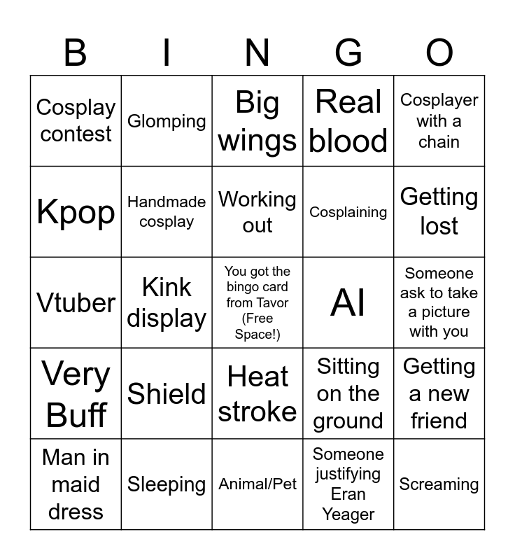 This bingo card has a free space and 92 words: Half as much online, cosplay malfunction, Animal/Pet, Cosplayer with a hammer, Dream SMP, Furry, Flip, Man in maid dress, Youtube series cosplay, Sword fight, Maid dress, Bunny suit, Gender bend, Cosplaining, Crazy size for a prop, Cosplayer with a chain, Big wings, Full face paint, Typos, Boba tea, Bald cosplayer, Spoken Character reference, Sad person at the con, Armor, Shield, Handmade cosplay, Medkit, Creepy Hentai shirt, Your music is too loud, Cosplay fix, Sleeping, Heat stroke, Eating Real food, Fight!!!, Glomping, Unsettling cosplay, Extremely poor photo, Smoking, Working out, Sitting on the ground, Vtuber, Very Buff, Someone ask to take a picture with you, Jesus, Screaming, Voice actor, Free stuff, Con-Stink, Survey, Cosplay with moving parts/LEDs, Someone Famous, Full cast (Yes all of them), Body pillow/ Large plushie, Your favorite character, AMONGUS, Awooga moment, TikTok, Kpop, Dinosaur, Kink display, Free hugs, Cute Couple, Guy who is definitely an Incel, Someone very old, Singing circles, Someone justifying Eran Yeager, Normal people, Someone with bare feet, Topless, Panic attack, I hate humans, Argument, Real blood, Candy!, Last minute change, Negotiate /Haggling, Getting a new friend, Unrecognizable Cosplay, Under age WTF, Overpriced Food, Popular Cosplayer, AI, Cosplay contest, Something funny at the Cosplay contest, Cosplay contest go wrong, There isn't a human in the cosplay, Kiss on the stage, Fall of the stage, Running somewhere, Group run, Getting lost and Someone making a joke about your Cosplay.
