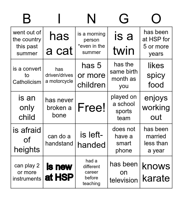 This bingo card has a free space and 24 words: can do a handstand, is new at HSP, has 5 or more children, can play 2 or more instruments, has been at HSP for 5 or more years, went out of the country this past summer, is a convert to Catholicism, has a cat, played on a school sports team, is left-handed, has the same birth month as you, is an only child, does not have a smart phone, has been married less than a year, has driven/drives a motorcycle, has been on television, enjoys working out, is a morning person *even in the summer, likes spicy food, has never broken a bone, knows karate, is afraid of heights, is a twin and had a different career before teaching.