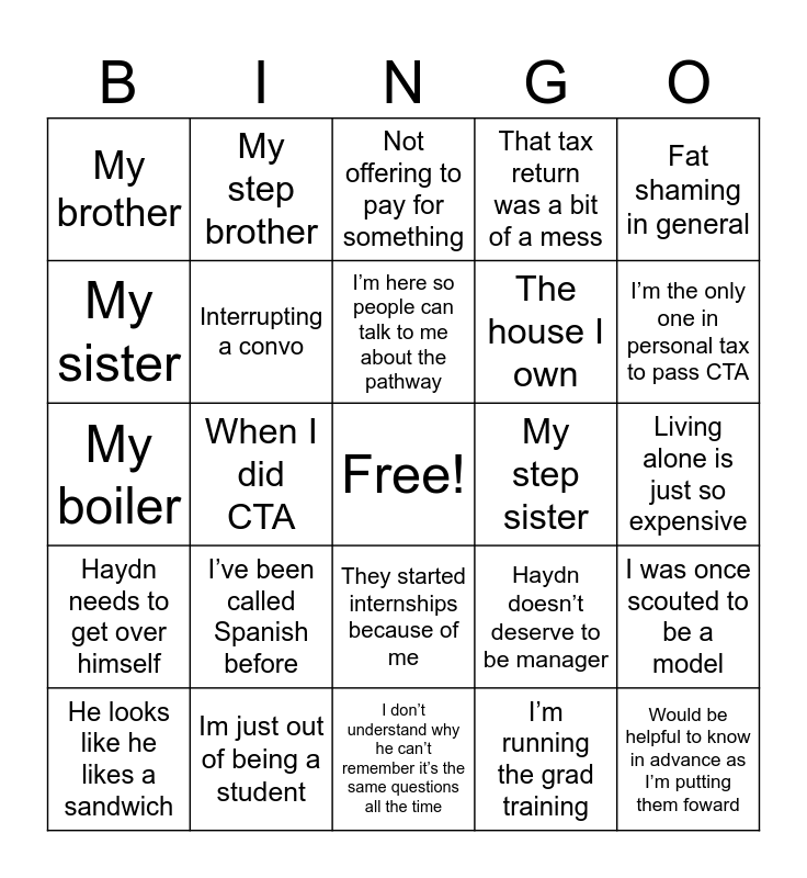 This bingo card has a free space and 24 words: I’ve been called Spanish before, Im just out of being a student, I’m here so people can talk to me about the pathway, He looks like he likes a sandwich, Fat shaming in general, My brother, My sister, My step brother, My step sister, They started internships because of me, The house I own, My boiler, Haydn doesn’t deserve to be manager, I was once scouted to be a model, Interrupting a convo, I’m running the grad training, Living alone is just so expensive, Not offering to pay for something, I’m the only one in personal tax to pass CTA, When I did CTA, Would be helpful to know in advance as I’m putting them foward, Haydn needs to get over himself, That tax return was a bit of a mess and I don’t understand why he can’t remember it’s the same questions all the time.