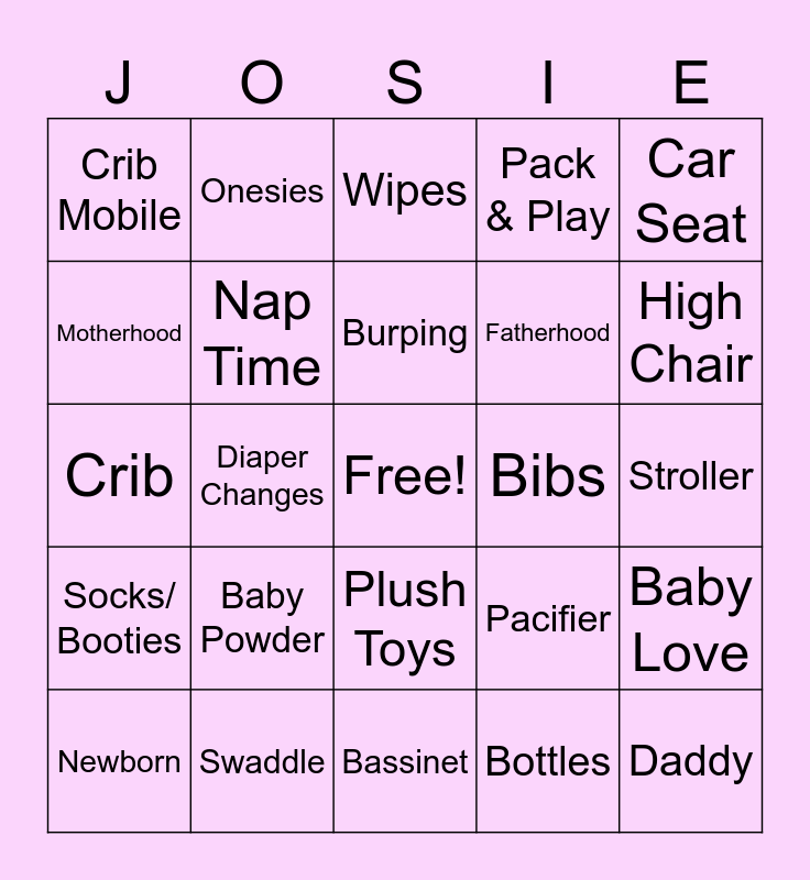 This bingo card has a free space and 43 words: Mommy, Daddy, Baby, Newborn, Diapers, Bottles, Wipes, Baby Monitor, Car Seat, Swaddle, Pack & Play, Bibs, Plush Toys, Baby Powder, Baby Gate, Bassinet, Rocking Chair, Crib, Blankets, High Chair, Onesies, Diaper Bag, Burp Cloths, Crib Mobile, Rattle, Stroller, Baby Lotion, Baby Books, Pacifier, Socks/ Booties, Carrier/ Sling, Baby Love, Cooing, Diaper Changes, Sonogram/ Ultrasound, Wright Family, First Smile, Burping, Motherhood, Fatherhood, Lullaby, Nap Time and Newborn Cuddles.