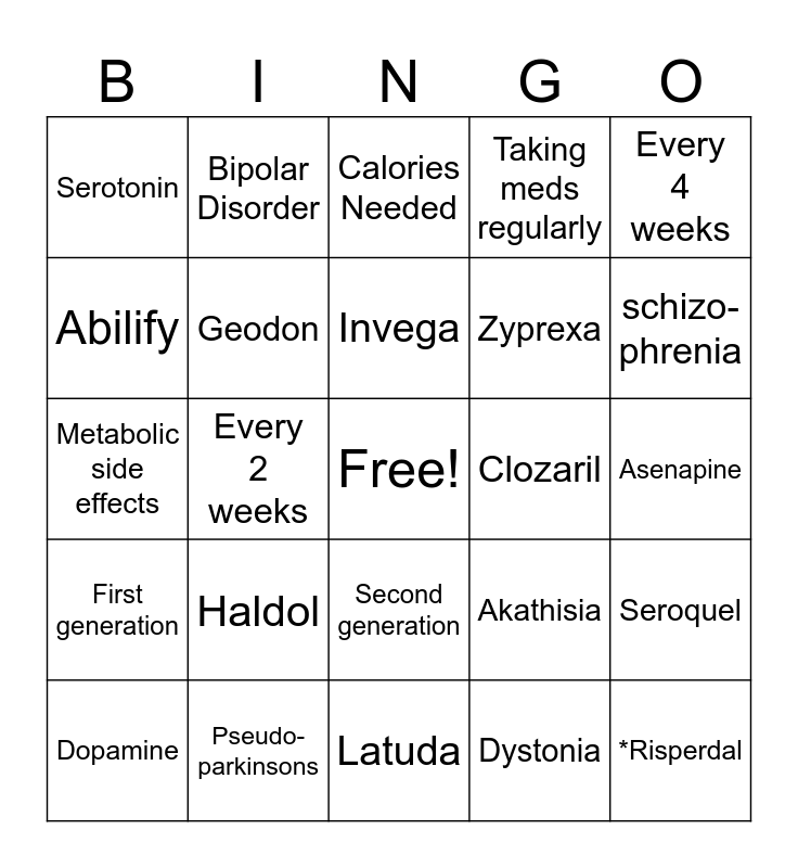 This bingo card has a free space and 24 words: Haldol, Pseudo- parkinsons, Invega, Dopamine, Every 4 weeks, Serotonin, Abilify, Bipolar Disorder, Clozaril, Second generation, Zyprexa, Metabolic side effects, Akathisia, Seroquel, Geodon, Dystonia, Asenapine, Calories Needed, schizo- phrenia, Every 2 weeks, *Risperdal, First generation, Taking meds regularly and Latuda.