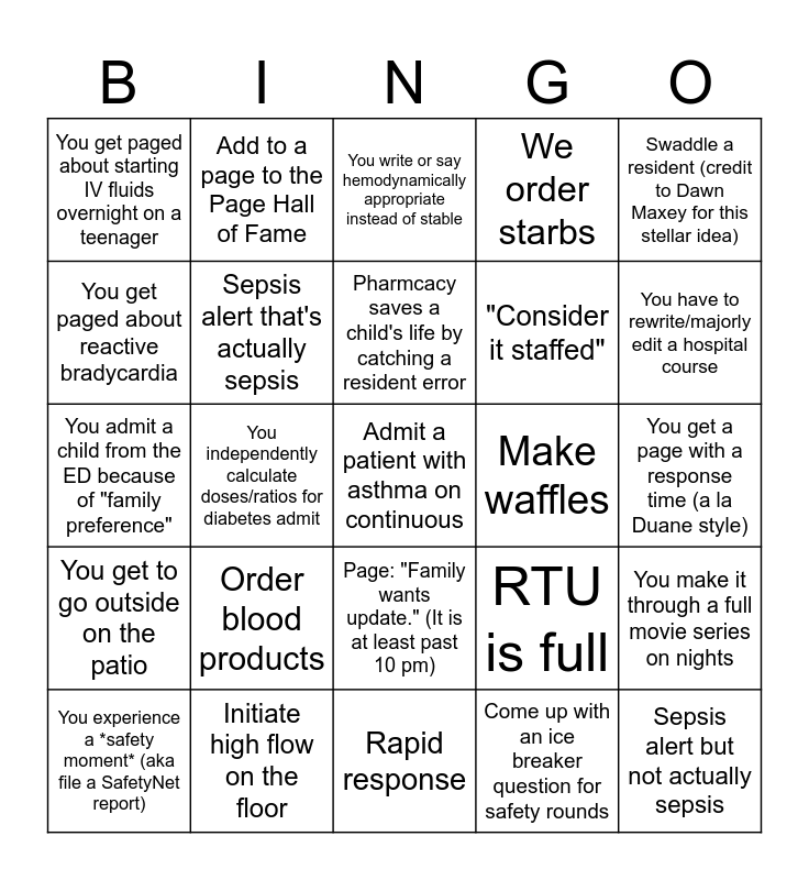 This bingo card has 25 words: Order blood products, Rapid response, Pharmcacy saves a child's life by catching a resident error, You experience a *safety moment* (aka file a SafetyNet report), Swaddle a resident (credit to Dawn Maxey for this stellar idea), You get paged about starting IV fluids overnight on a teenager, You get paged about reactive bradycardia, Add to a page to the Page Hall of Fame, Make waffles, Page: "Family wants update." (It is at least past 10 pm), "Consider it staffed", You admit a child from the ED because of "family preference", RTU is full, You make it through a full movie series on nights, Sepsis alert that's actually sepsis, Sepsis alert but not actually sepsis, You get a page with a response time (a la Duane style), You write or say hemodynamically appropriate instead of stable, You have to rewrite/majorly edit a hospital course, You independently calculate doses/ratios for diabetes admit, Admit a patient with asthma on continuous, Initiate high flow on the floor, You get to go outside on the patio, We order starbs and Come up with an ice breaker question for safety rounds.