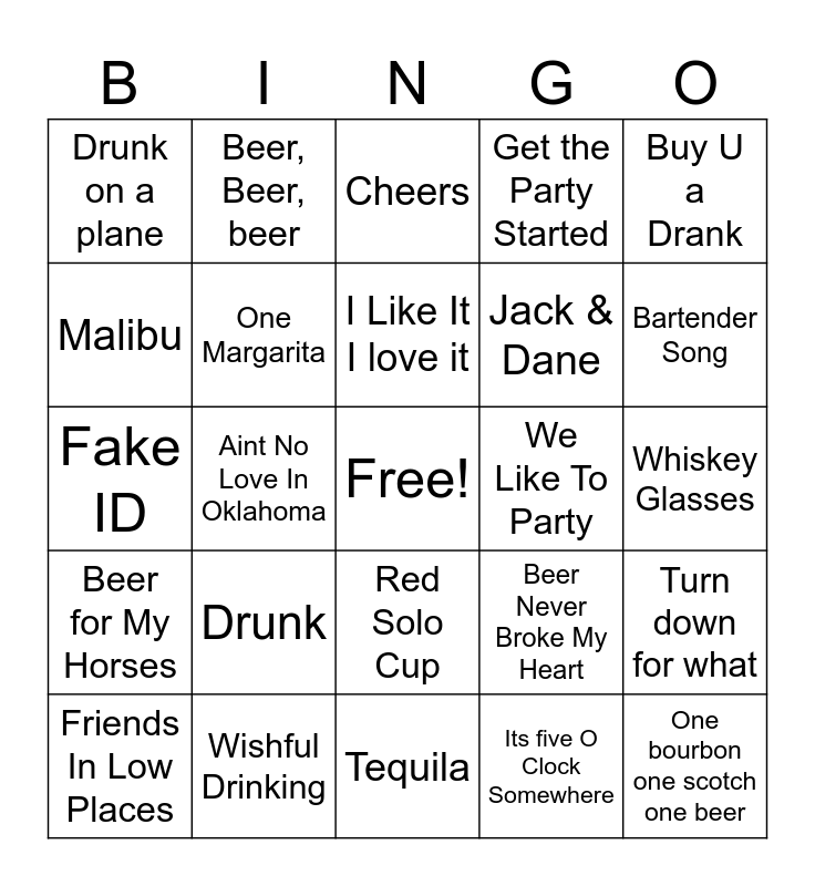 This bingo card has a free space and 44 words: Shots, One bourbon one scotch one beer, Margaritaville, Friends In Low Places, Fireball, Its five O Clock Somewhere, Cheers, Tik tok, Buy U a Drank, Wishful Drinking, Get the Party Started, We Like To Party, Red Solo Cup, Drunk, Domino, Tequila, Escape, Fake ID, Raise Your Glass, Bartender Song, Beer, Beer, beer, Ten Round with Jose Cuervo, I love This Bar, Drunk on a plane, You Proof, Whiskey Glasses, Tennessee Whiskey, One Thing at a time, Beer Never Broke My Heart, Beer for My Horses, Die Young, Turn down for what, Streams of Whiskey, House party, Aint No Love In Oklahoma, Alcohol, Hole in the bottle, Day Dreaming, I Like It I love it, Malibu, Jack & Dane, One too Many, One Margarita and Hurts So Good.