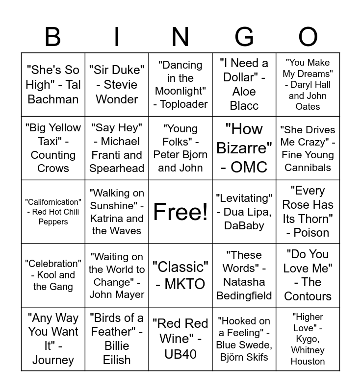 This bingo card has a free space and 51 words: "Riptide" - Vance Joy, "Higher Love" - Kygo, Whitney Houston, "Lil Boo Thang" - Paul Russell, "Red Red Wine" - UB40, "Waiting on the World to Change" - John Mayer, "Baby" - Bakermat, "Sir Duke" - Stevie Wonder, "Every Morning" - Sugar Ray, "Big Yellow Taxi" - Counting Crows, "Stumblin' In" - Cyril, "Say Hey" - Michael Franti and Spearhead, "I Need a Dollar" - Aloe Blacc, "Do You Love Me" - The Contours, "These Words" - Natasha Bedingfield, "Banana Pancakes" - Jack Johnson, "Calm Down" - Rema, Selena Gomez, "Young Folks" - Peter Bjorn and John, "Levitating" - Dua Lipa, DaBaby, "There She Goes" - The La's, "You Make My Dreams" - Daryl Hall and John Oates, "Walking on Sunshine" - Katrina and the Waves, "Hooked on a Feeling" - Blue Swede, Björn Skifs, "She's So High" - Tal Bachman, "How Bizarre" - OMC, "Hey Soul Sister" - Train, "What's Up" - 4 Non Blondes, "She Drives Me Crazy" - Fine Young Cannibals, "Mr. Jones" - Counting Crows, "Any Way You Want It" - Journey, "Dancing in the Moonlight" - Toploader, "Go Your Own Way" - Fleetwood Mac, "Spirit in the Sky" - Norman Greenbaum, "The Joker" - Steve Miller Band, "Tiny Dancer" - Elton John, "Slow It Down" - Benson Boone, "Birds of a Feather" - Billie Eilish, "Too Sweet" - Hozier, "Stargazing" - Miles Smith, "Pompeii" - Bastille, "All Star" - Smash Mouth, "Every Rose Has Its Thorn" - Poison, "Celebration" - Kool and the Gang, "Rude" - MAGIC!, "Bad Day" - Daniel Powter, "People Are Crazy" - Billy Currington, "How to Save a Life" - The Fray, "Californication" - Red Hot Chili Peppers, "Nothin' But a Good Time" - Poison, "Werewolves of London" - Warren Zevon, "Classic" - MKTO and "We Didn't Start the Fire" - Billy Joel.