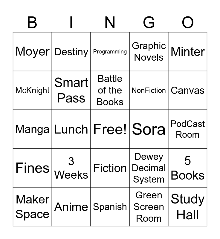 This bingo card has a free space and 24 words: 3 Weeks, Anime, Battle of the Books, Maker Space, Minter, Moyer, McKnight, Destiny, Sora, Fiction, NonFiction, Manga, Dewey Decimal System, 5 Books, Smart Pass, Green Screen Room, PodCast Room, Programming, Canvas, Lunch, Study Hall, Fines, Graphic Novels and Spanish.
