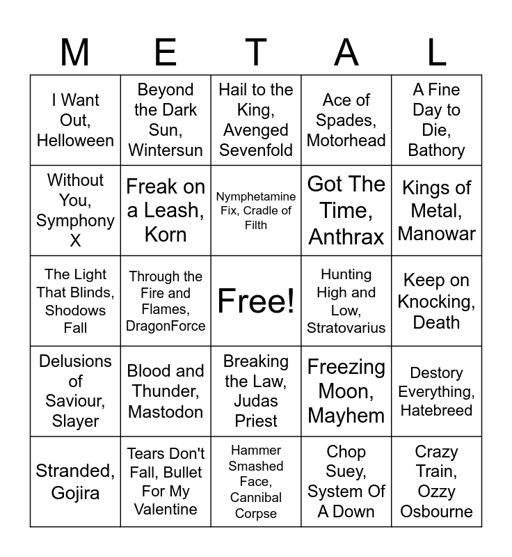 This bingo card has a free space and 39 words: Paranoid, Black Sabbath, Duality, Slipknot, Symphony Of Destruction, Megadeath, Freak on a Leash, Korn, Stranded, Gojira, Breaking the Law, Judas Priest, Nymphetamine Fix, Cradle of Filth, In the Minds of Evil, Deicide, A Fine Day to Die, Bathory, Delusions of Saviour, Slayer, Through the Fire and Flames, DragonForce, Ace of Spades, Motorhead, Crazy Train, Ozzy Osbourne, Keep on Knocking, Death, Hunting High and Low, Stratovarius, Blood and Thunder, Mastodon, Enter Sandman, Metallica, I Want Out, Helloween, The Trooper, Iron Maiden, Freezing Moon, Mayhem, Without You, Symphony X, Hammer Smashed Face, Cannibal Corpse, Got The Time, Anthrax, Kings of Metal, Manowar, Nemo, Nightwish, Cry for the Moon, Epica, We are the Others, Delain, Slaughter of the Soul, At The Gates, Raise Your Horns, Amon Amarth, Beyond the Dark Sun, Wintersun, My Curse, Killswitch Engage, The Heart from Your Hate, Trivium, Hail to the King, Avenged Sevenfold, Tears Don't Fall, Bullet For My Valentine, Chop Suey, System Of A Down, Laid to Rest, Lamb of God, Destory Everything, Hatebreed, The Light That Blinds, Shodows Fall and Alone In A Room, Asking Alexandria.