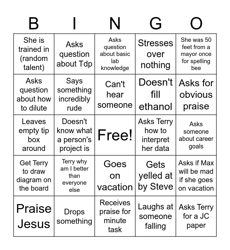 This bingo card has a free space and 24 words: Terry why am I better than everyone else, Drops something, Can't hear someone, Praise Jesus, She was 50 feet from a mayor once for spelling bee, She is trained in (random talent), Asks question about how to dilute, Asks question about Tdp, Asks Terry how to interpret her data, Goes on vacation, Doesn't fill ethanol, Leaves empty tip box around, Gets yelled at by Steve, Asks if Max will be mad if she goes on vacation, Says something incredibly rude, Laughs at someone falling, Asks someone about career goals, Asks question about basic lab knowledge, Asks for obvious praise, Doesn't know what a person's project is, Asks Terry for a JC paper, Get Terry to draw diagram on the board, Stresses over nothing and Receives praise for minute task.