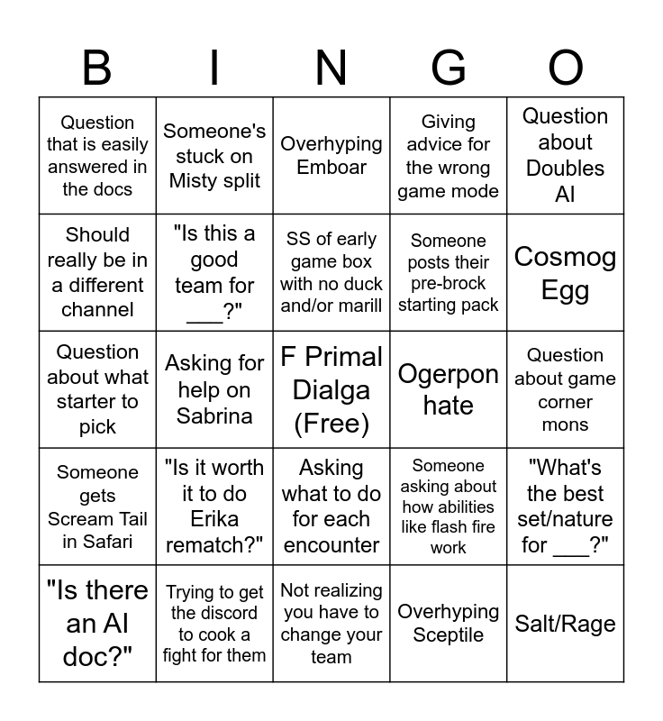 This bingo card has a free space and 40 words: Someone doesn't actually know what 4.1 AI is, Question about what starter to pick, Snivy Hate, "Is this a good team for ___?", Trying to get the discord to cook a fight for them, Asking what to do for each encounter, SS of early game box with no duck and/or marill, Wipe, Question about Doubles AI, Someone gets Scream Tail in Safari, Asking for help on Sabrina, Giving advice for the wrong game mode, Salt/Rage, Question about game corner mons, Ogerpon hate, "Is it worth it to do Erika rematch?", Blood Moon Ursaluna, Question that is easily answered in the docs, Question that is easily answered in the dex, Overhyping Emboar, "What's the best set/nature for ___?", Overhyping Sceptile, Someone posts their pre-brock starting pack, Should really be in a different channel, Obvious Discord Demon, Thinking Shifu is good for some reason, Post ko switch in scores, Why did the AI do ___ (Well known behavior), Why did the AI do ___ (Nobody knows), "Is it worth it to do (Johto Gym Leader)", Thinking Ceruledge is good for some reason, "Is there an AI doc?", Cue Ball Camron moment, Someone asking about how abilities like flash fire work, Cosmog Egg, Not realizing you have to change your team, Hard Pult on Caly/Zapdos deny rocks, Hardstuck on Surge, Someone's stuck on Misty split and Normal mode Kommo-o sweep.