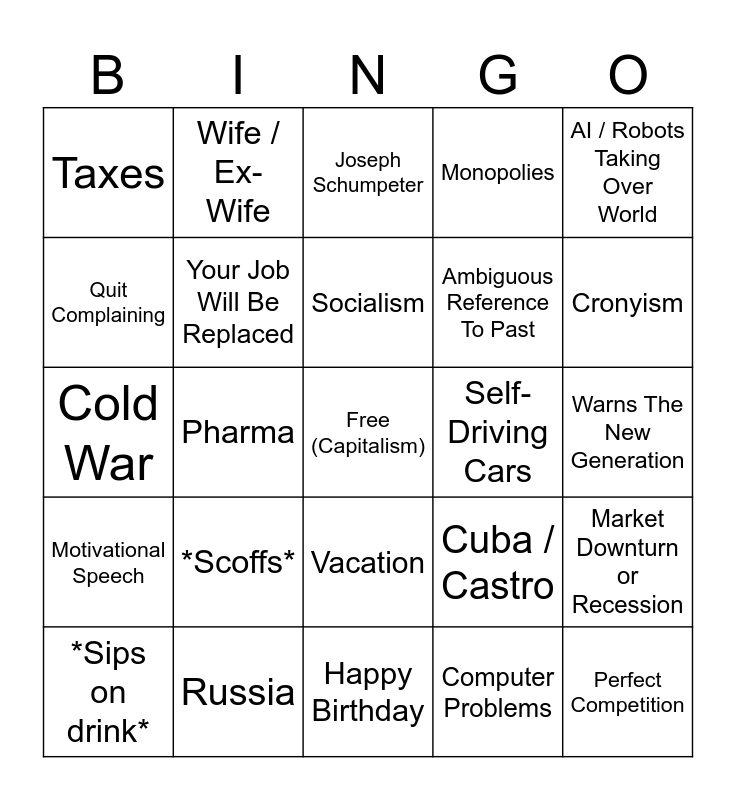 This bingo card has a free space and 24 words: *Scoffs*, Russia, Socialism, *Sips on drink*, AI / Robots Taking Over World, Taxes, Quit Complaining, Wife / Ex-Wife, Self-Driving Cars, Vacation, Ambiguous Reference To Past, Cold War, Cuba / Castro, Market Downturn or Recession, Your Job Will Be Replaced, Computer Problems, Warns The New Generation, Joseph Schumpeter, Cronyism, Pharma, Perfect Competition, Motivational Speech, Monopolies and Happy Birthday.