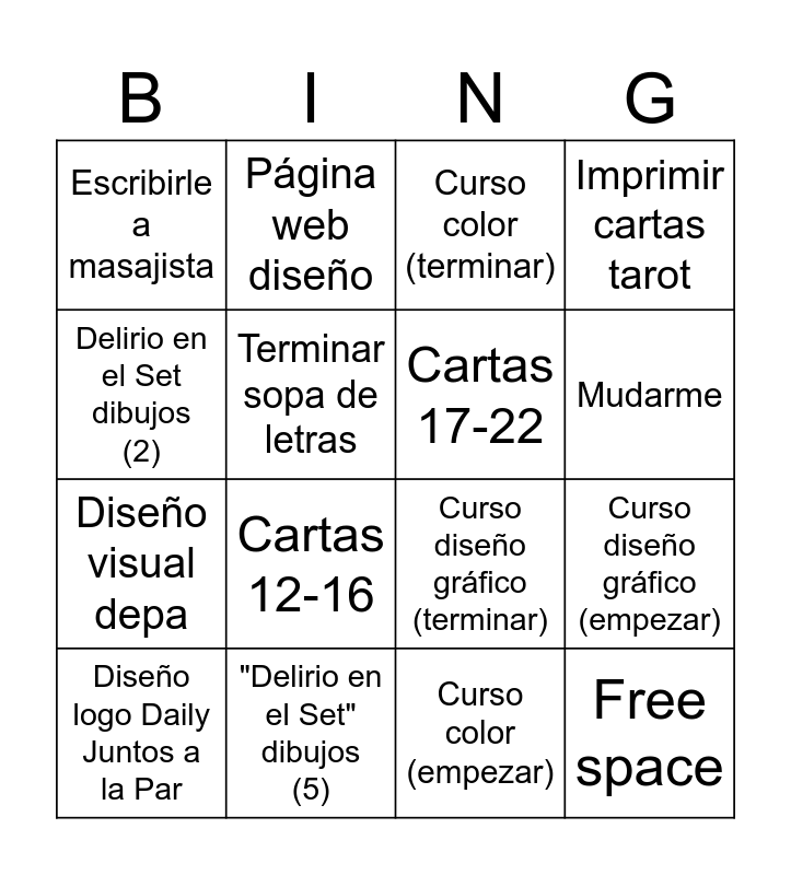This bingo card has 16 words: "Delirio en el Set" dibujos (5), Curso diseño gráfico (empezar), Curso color (terminar), Escribirle a masajista, Diseño visual depa, Página web diseño, Curso diseño gráfico (terminar), Curso color (empezar), Delirio en el Set dibujos (2), Terminar sopa de letras, Diseño logo Daily Juntos a la Par, Imprimir cartas tarot, Cartas 12-16, Mudarme, Cartas 17-22 and Free space.