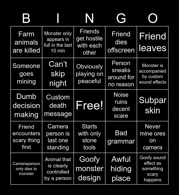 This bingo card has a free space and 39 words: Abrupt ambiance change, 2+ mins of nothing dialogue, Weirdly written dialogue, Can’t skip night, Cameraperson only dies to monster, Starts with only stone tools, Obviously playing on peaceful, Monster disappears into thin air, Friend leaves, Friend encounters scary thing first, Custom death message, Friend dies offscreen, Goofy sound effect as something scary happens, Subpar skin, Noise ruins decent scare, Camera person is last one standing, Ugly base, Farm animals are killed, Crazy thing is done off camera, Bad grammar, Someone goes mining, Goofy monster design, Person sneaks around for no reason, Monster is accompanied by custom sound effects, Video is over 20 minutes long, Video ends on a jumpscare, Only II players, ~5 min gap between scares, Mine is built around house, Monster only appears in full in the last 10 min, Dumb names, Death is permanent, Friends get hostile with each other, Animal that is clearly controlled by a person, Awful hiding place, Someone goes on a tangent, Never mine ores on camera, Dumb decision making and Ignores basic Minecraft mechanics.