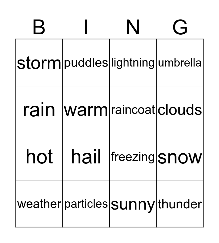 This bingo card has a free space and 15 words: weather, thunder, lightning, storm, clouds, rain, hail, sunny, warm, hot, snow, umbrella, raincoat, puddles and particles.