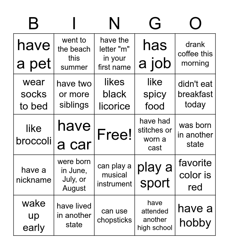 This bingo card has a free space and 29 words: wake up early, know how to swim, have a car, bite your fingernails, have a pet, have the letter "m" in your first name, have two or more siblings, were born in June, July, or August, have had stitches or worn a cast, have lived in another state, was born in another state, have a hobby, can use chopsticks, have attended another high school, didn't eat breakfast today, are afraid of spiders, can play a musical instrument, have a nickname, drank coffee this morning, like broccoli, play a sport, are an only child, like spicy food, wear socks to bed, has a job, went to the beach this summer, favorite color is red, likes black licorice and has a hidden talent.
