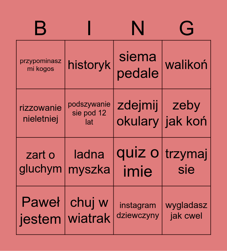 This bingo card has 16 words: chuj w wiatrak, trzymaj sie, siema pedale, przypominasz mi kogos, zart o gluchym, historyk, quiz o imie, instagram dziewczyny, rizzowanie nieletniej, podszywanie sie pod 12 lat, Paweł jestem, walikoń, ladna myszka, zeby jak koń, zdejmij okulary and wygladasz jak cwel.
