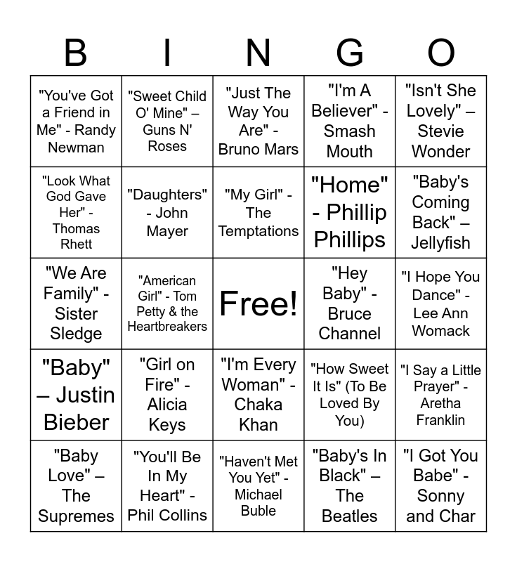 This bingo card has a free space and 34 words: "Baby Come Back" – Player, "Baby's In Black" – The Beatles, "There Goes My Baby" – The Drifters, "Baby One More Time" – Britney Spears, "Baby" – Justin Bieber, "Daughters" - John Mayer, "Isn't She Lovely" – Stevie Wonder, "Baby Love" – The Supremes, "Sweet Child O' Mine" – Guns N' Roses, "Brown Eyed Girl" – Van Morrison, "My Girl" - The Temptations, "Just The Way You Are" - Bruno Mars, "Baby, Baby, Baby" – TLC, "Baby, What a Big Surprise" – Chicago, "Hey Baby" - Bruce Channel, "Baby's Coming Back" – Jellyfish, "You'll Be In My Heart" - Phil Collins, "We Are Family" - Sister Sledge, "Girl on Fire" - Alicia Keys, "How Sweet It Is" (To Be Loved By You), "I'm Every Woman" - Chaka Khan, "Love Will Keep Us Together" - Captain & Tennille, "You've Got a Friend in Me" - Randy Newman, "I Hope You Dance" - Lee Ann Womack, "Haven't Met You Yet" - Michael Buble, "I Got You Babe" - Sonny and Char, "I'm A Believer" - Smash Mouth, "The Lion Sleeps Tonight" - The Tokens, "Home" - Phillip Phillips, "Look What God Gave Her" - Thomas Rhett, "Greatest Love of All" - Whitney Houston, "American Girl" - Tom Petty & the Heartbreakers, "I Say a Little Prayer" - Aretha Franklin and "Build Me Up Buttercup" - The Foundations.