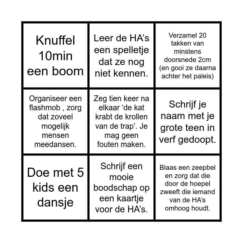 This bingo card has 29 words: Free!, Maak een selfie met Swatje, Bouw een zandkasteel van 2 verdiepen in de zandbak, Geef alle animatoren een coole passende nickname, Knuffel 10min een boom, Verzamel 20 takken van minstens doorsnede 2cm (en gooi ze daarna achter het paleis), Doe met 5 kids een dansje, Klim naar de top van de spider, Schrijf een elfje, Leg met je tenen een knoop in een touw, Breng water naar de HA’s, Zeg het alfabet achterstevoren op, Zet een stok recht op de grond. Zet je voorhoofd tegen de stok. Draai tien rondjes en probeer over de stok te springen., Bedenk vijf spreekwoorden over het weer., Zoek 25 groene voorwerpen., Werp vanop twee meter afstand twintig kroonkurken in een schaaltje., Schrijf met letters uit een krant: “Dit is het allerbeste speelplein ooit!”, Schmink jezelf als Swat, Zeg tien keer na elkaar ‘de kat krabt de krollen van de trap’. Je mag geen fouten maken., Bouw een kaartenhuisje van vier verdiepingen., Balanceer een bezemsteel gedurende tien seconden op je kin., Verzin een smurfennaam voor alle spelers uit je groep., Blaas een zeepbel en zorg dat die door de hoepel zweeft die iemand van de HA’s omhoog houdt., Schrijf je naam met je grote teen in verf gedoopt., Organiseer een flashmob , zorg dat zoveel mogelijk mensen meedansen., Leer de HA’s een spelletje dat ze nog niet kennen., Zorg dat je helemaal in het rood gekleed bent tijdens de spelemee., Schrijf een mooie boodschap op een kaartje voor de HA’s. and Maak een gat in een krant. Kruip erdoor zonder dat ze scheurt..