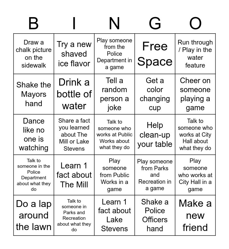 This bingo card has 25 words: Learn 1 fact about The Mill, Learn 1 fact about Lake Stevens, Tell a random person a joke, Do a lap around the lawn, Run through / Play in the water feature, Draw a chalk picture on the sidewalk, Shake the Mayors hand, Try a new shaved ice flavor, Help clean-up your table, Play someone from Public Works in a game, Get a color changing cup, Dance like no one is watching, Play someone from Parks and Recreation in a game, Play someone who works at City Hall in a game, Drink a bottle of water, Make a new friend, Talk to someone who works at City Hall about what they do, Play someone from the Police Department in a game, Cheer on someone playing a game, Share a fact you learned about The Mill or Lake Stevens, Talk to someone who works at Public Works about what they do, Talk to someone in Parks and Recreation about what they do, Talk to someone in the Police Department about what they do, Free Space and Shake a Police Officers hand.