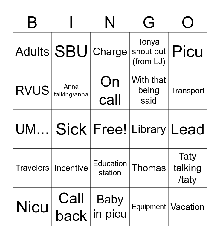 This bingo card has a free space and 24 words: Incentive, Call back, On call, Nicu, Picu, Adults, RVUS, SBU, Library, Education station, With that being said, UM…, Thomas, Taty talking /taty, Anna talking/anna, Equipment, Lead, Charge, Transport, Sick, Vacation, Travelers, Tonya shout out (from LJ) and Baby in picu.