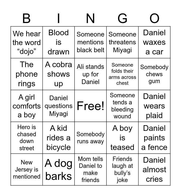 This bingo card has a free space and 32 words: Friends laugh at bully’s joke, An Audience quiets down, Daniel questions Miyagi, Mom just doesn’t understand, Hero is chased down street, A cobra shows up, Daniel waxes a car, Daniel paints a fence, Blood is drawn, Daniel does the crane, Ali stands up for Daniel, Someone mentions black belt, Someone dials a phone, Miyagi rubs hands together, Someone tends a bleeding wound, Someone wears a headband, New Jersey is mentioned, A girl comforts a boy, Somebody runs away, A kid rides a bicycle, A boy is teased, Someone uses chopsticks, Daniel wears plaid, A dog barks, Daniel almost cries, Someone threatens Miyagi, Someone folds their arms across chest, The phone rings, We hear the word “dojo”, Mom tells Daniel to make friends, Someone writes on a chalkboard and Somebody chews gum.
