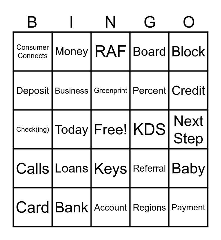 This bingo card has a free space and 24 words: Loans, Bank, Greenprint, Card, Block, Consumer Connects, Deposit, Money, KDS, Keys, Percent, Check(ing), Referral, Baby, Business, Regions, Next Step, RAF, Credit, Today, Payment, Calls, Board and Account.