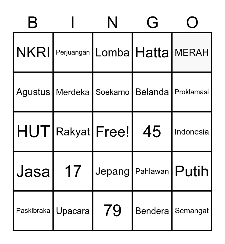 This bingo card has a free space and 24 words: 17, Upacara, Soekarno, Paskibraka, MERAH, NKRI, Agustus, Perjuangan, 45, Jepang, Belanda, HUT, Pahlawan, Putih, Merdeka, Bendera, Indonesia, Lomba, Proklamasi, Rakyat, Semangat, Jasa, Hatta and 79.